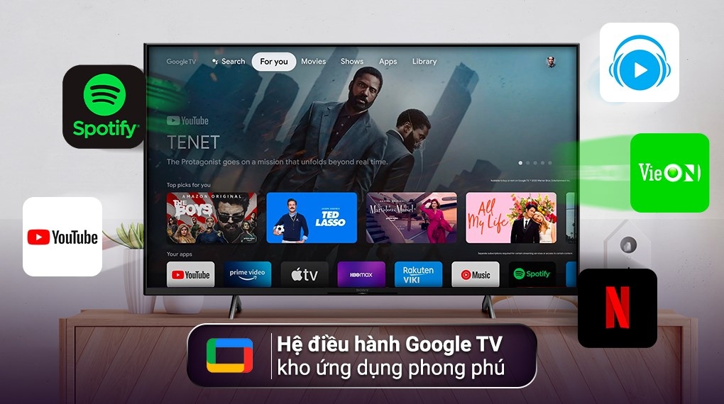 Hệ điều hành Google TV với giao diện thân thiện, dễ sử dụng, cùng với kho ứng dụng phong phú: FPT Play, Galaxy Play (Fim+), Google Play, Netflix, VieON, YouTube,... đáp ứng đa dạng các nhu cầu giải trí cho các thành viên trong gia đình.