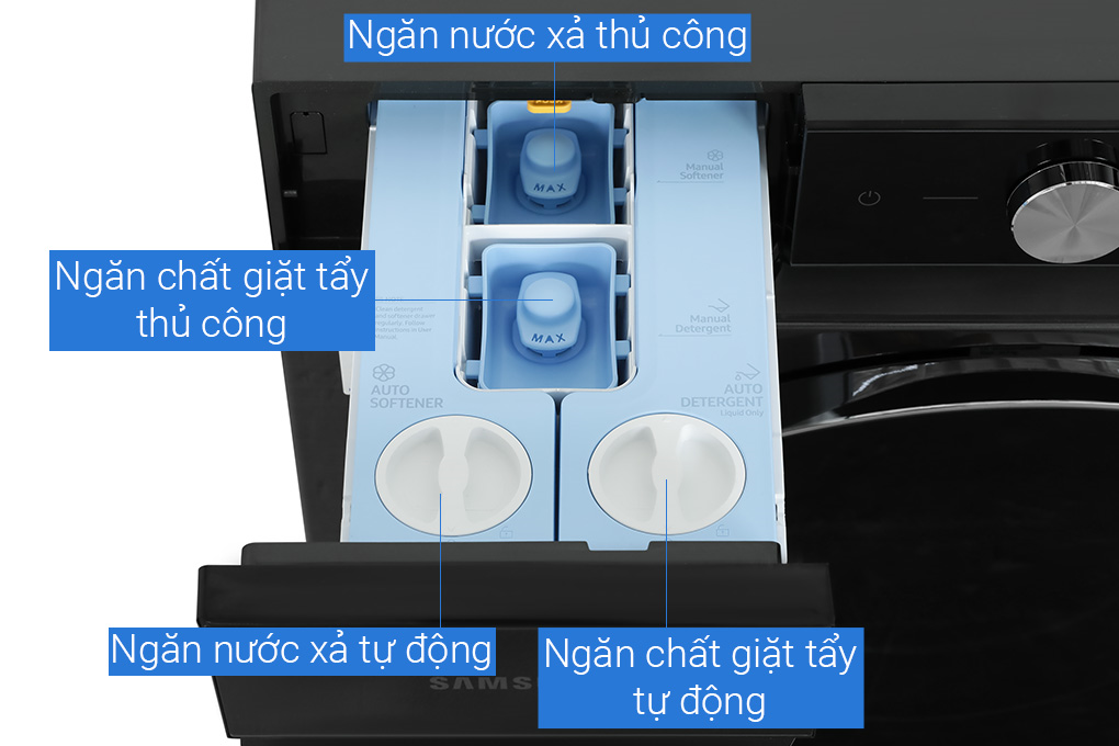 - Cảm biến AI Dispenser: Có khả năng tự động phân bổ lượng nước giặt/xả chính xác theo khối lượng quần áo, cho hiệu quả giặt sạch tối ưu. Người dùng chỉ cần đổ đầy vào ngăn AI Dispenser 1 lần và có thể sử dụng được đến 1 tháng (tùy theo tần suất sử dụng).