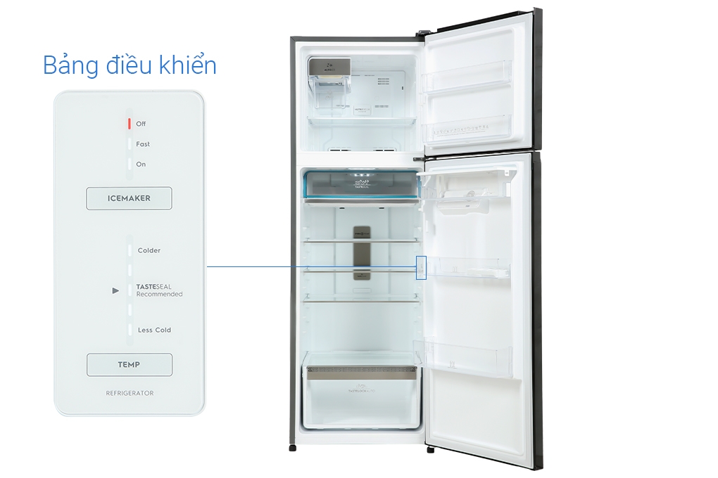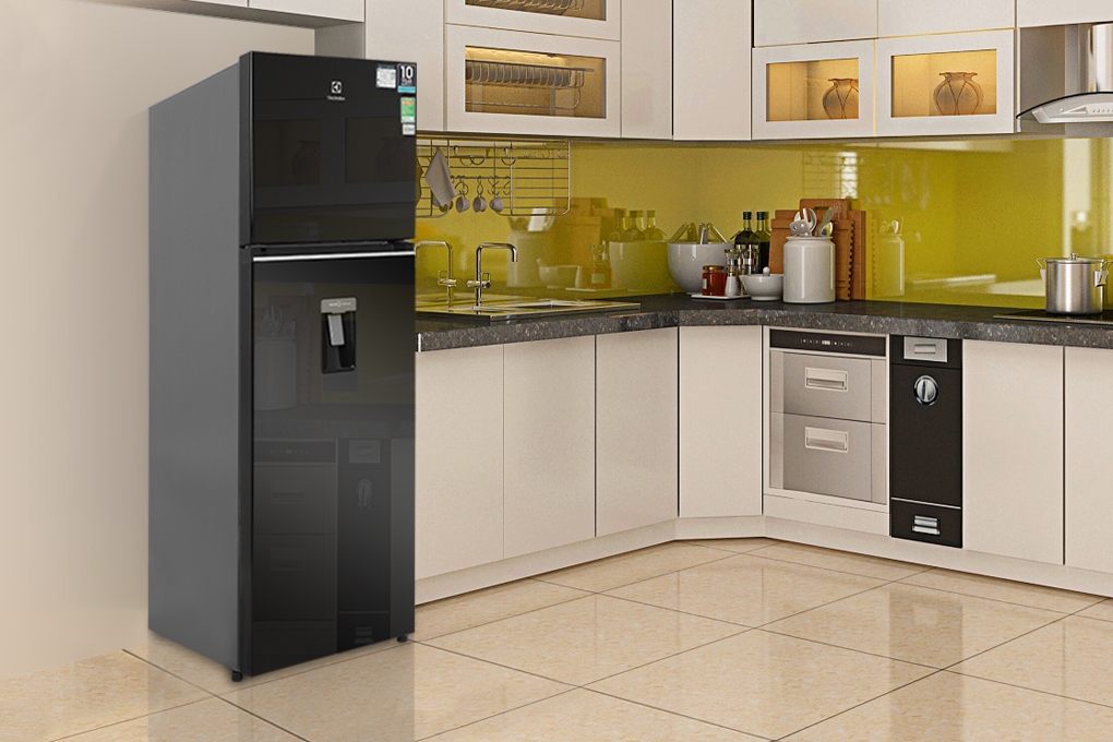 Dung tích 341 lít rộng rãi, ngăn đá trên với gam màu đen tinh tế, sang trọng cho ngôi nhà