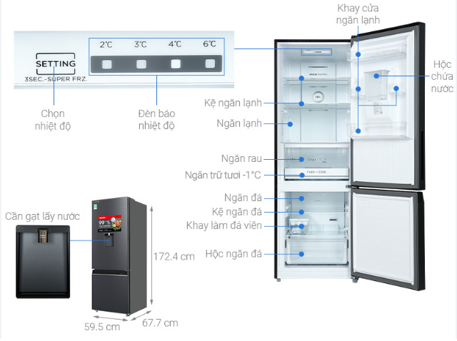 Điểm nổi bật đầu tiên khi nhìn vào chiếc tủ lạnh này là khay lấy nước tự động nằm ở bên ngoài cửa tủ, chỉ cần vài thao tác đơn giản là bạn đã có ngay ly nước mát lạnh tức thì. Hộp chứa nước được làm từ nhựa an toàn, không chứa BPA, đảm bảo an toàn cho sức khỏe.